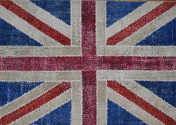 Questo tappeto è stato realizzato in Turchia utilizzando frammenti di antichi tappeti , questi frammenti vengono trattati con delle pietre e poi ricolorati con colori spesso molto vivaci in questo caso riassemblati dando vita alla bandiera inglese.